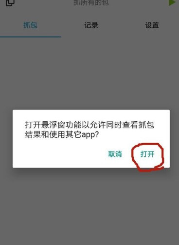 4、这时会提示,打开悬浮窗功能以允许同时查看抓包结果和使用其它app?点击打开。