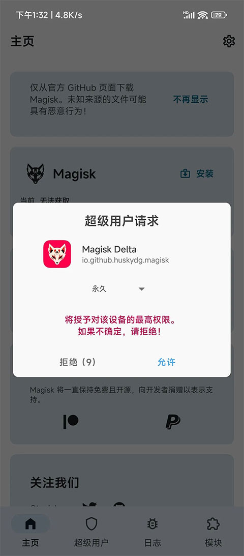2、下载安装一下Delta版本Magisk安装打开,给ROOT权限。
