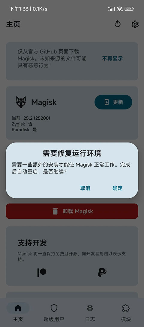 3、授权以后,杀掉后台重新打开,会提示修复环境,点取消。