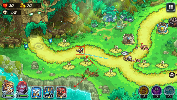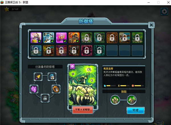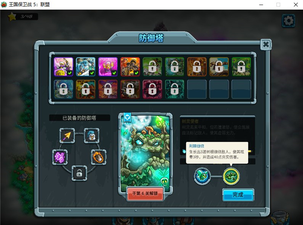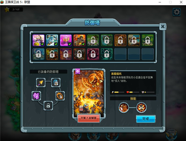 值得注意的是第三张地图不推荐使用岩浆坑和死灵法师作为拦截,前者出恶魔随机和眼精的高随机性与机动性撞在一起容易让人高血压,后者出骷髅效率太低。 推荐第三张地图使用大树作为拦截,死灵法师作为副塔兼职法术输出,哥布林哨兵塔作为后期关卡的大怪拦截。