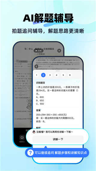 拍照识题后不仅提供答案,还会展示详细步骤和思路,用户可在互动提问中理解背后逻辑,从而真正掌握解法。