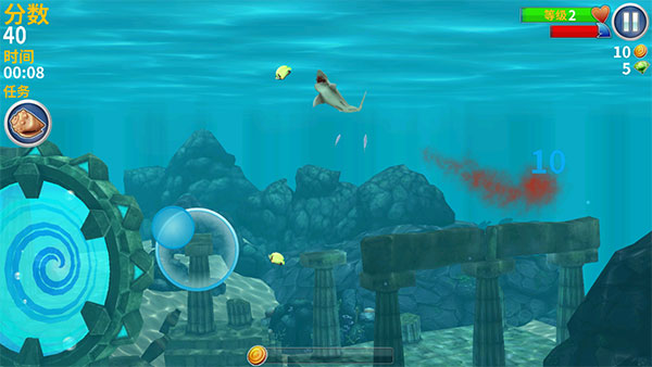 2、移动摇杆控制鲨鱼进行吞噬其他小鱼。