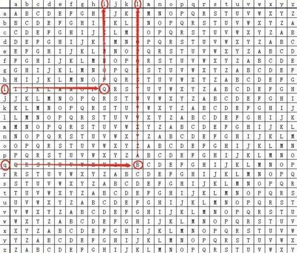 第二个密钥是i,密文是q,从左侧第一列找到密钥i,沿着这一行向右找到密文Q,沿着Q这一列向上找到最上面的字母y。