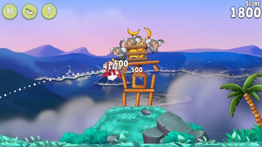 箱子藏在一个很高的平台上,发射黄色的小鸟可取得其中的香蕉。